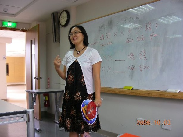 我的活動是數字練習。經過與老師反覆討論,最後留下兩個活動,第一個簡單的,是我把廣告發的扇子貼上編號,讓大家一人一把,然後就說:[我是1號,我要找2號]。看起來好像很白痴,不過只要大家把數字19換成某種你不會的語言(例如德文、拉丁文),大概就能體會迅速確實唸出來對那些學生(都是大人,博士研究生之類的)的困難了。而且,句子裡的其他部分(我是某號,我要找某號),還得用漢語拼音寫在黑板上,學生就像代入方程式一樣把拼音跟數字唸出來。對這些中文程度零級的外國博士生而言,我寫方塊字其實是毫無意義的。