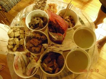下一個行程就非常的悲慘...羅東夜市大雨覓食記。首先,羅東的夜市第一個特色就是貴,第二個就是人爆多,加在一起贊曰:太扯了。不管隨便一個包心粉圓還是正常小籠包或者看似無名氣實則有玄機的大腸包小腸與三星肉串攤位,都要等到地老天荒。偏偏老天下起無情大雨,所以大家就與人群、天氣還有颱風過後無路燈的田邊小路奮戰,不經一番寒徹骨,終於在那小木屋聞到了晚餐香