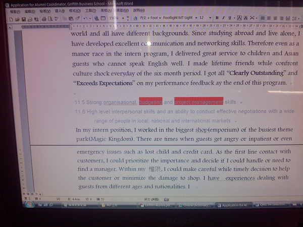 毛捲捲的傢伙也一天到晚在看工作,還幫我找了幾個他覺得不錯的職缺,所以我就來寫求職信了。這邊找工作要寫三個東西,cover letter+resume+response to selection criteria。第一個是封簡單扼要的信,把應徵的工作、自己的學經歷重點、連絡方式都寫好,但是不好寫,其實本來就是越短的東西越不容易寫好。第二個是一般的履歷表,不過外國不要自傳這東東。第三項也很難寫,而且還是大篇幅的,針對求才公司開出的條件,一項一項的回答過去的經驗如何符合對方的需求。